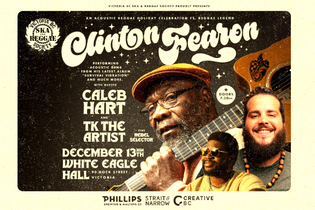For our reggae faithful we are excited to bring this unforgettable show to put an explanation mark on our most successful year and to celebrate the holiday season. For the first time in seven years Victoria BC Ska & Reggae Society is excited to welcome back reggae legend Clinton Fearon back to Victoria. Since his last appearance Clinton has been gaining traction and playing all over the world at various festivals and large events. For this show Clinton is excited to share tracks from his all acoustic album called "Survival Vibration" Released in April of 2024 this album is a rare all acoustic release with 11 conscious rootsy tracks. Yankee Nupe of Reggae-vibes.com praises the album and said in his review, " The guitar playing is top-notch, and the perfect vehicle for Fearon’s crisp, and still-strong voice." That's the thing about Clinton Fearon that is so special. The man barely ages!! His voice and delivery on stage still draws in anyone who is watching and listening. We are blessed to have him come to the Island. * Please note Clinton Fearon will be the second artist performing around 9:15pm*