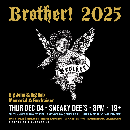 Brother! 2025 - In loving memory of our dear friends, John K. and Rob D. will be full of live music, free food, cheap drinks, awesome prizes and MORE! 🔥 Live performance by Conversation, Honeymoon Bay and Chuck Coles. With raffle prizes like Leafs and Raptors tickets, concert tickets, prize packs and more.