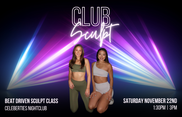 CLUB SCULPT - 50 minute full body sculpt workout, to the beat of the music. In a club setting - think club dance floor with lights meets mindful movement. For the most fun magical best 50 minute workout of your life. You’ll have some time after class to mingle, make new best friends, and enjoy our sponsored booths.