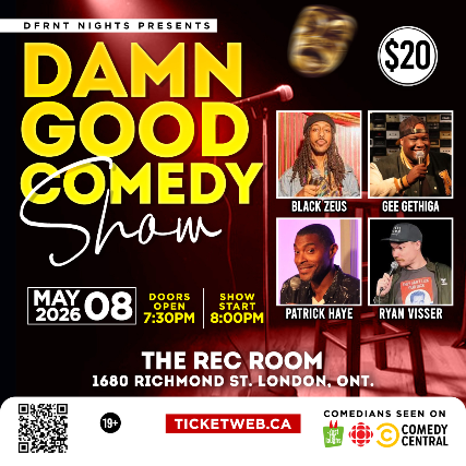 Doors:    7:30 PM Show:    8:00 PM The Rec Room Masonville Mall London, Ontario 19+ Event  Comedians seen on JFL, CBC Comedy, Comedy Central, and more!