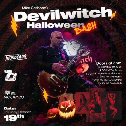 Devilwitch is a homegrown heavy metal rock n roll outfit from Toronto Canada founded by Canadian composer/guitar improvisationalist Mike Carbone. They've been working intensely on providing their audience with new music and electrifying live entertainment having supported many legendary artists live such as Yngwei Malmsteen, Pat Travers, Anvil, Wednesday 13, and Greg Howe to name a few. Grab yourself a ticket and a costume and come out to the ElMocambo this October 19th 2024 to celebrate in the spirit of Rock n Roll and Halloween. This is a party that you will not want to miss! In support of the band and adding that much more to the event are special guest performers and dear friends to the Witch. A fine assortment of hard rock and heavy metal groups; Thunderor, Zigseven, and Death Club. Last but not least Trick or Treat yourself to a feast for your eyes ,Live burlesque performers The Hellbound Harlots, and last but not least the lovely Starlotte Satine. Get your tickets now and come to the rock n roll party!