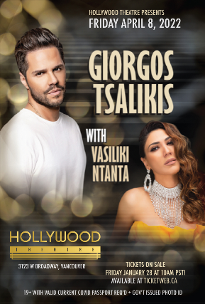 ***** MORE TICKETS JUST RELEASED ***** Hollywood Theatre is proud to present... GIORGOS TSALIKIS  With Special Guest VASILIKI NTANTA Friday April 8, 2022 Hollywood Theatre - 3123 W. Broadway Vancouver, B.C. Canada Doors 7:00 19+ with Current Vaccination Passport Required + Gov't Issued Photo ID * RESERVE A TABLE ! * * LOTS OF ROOM TO MINGLE *  * LOTS OF ROOM TO DANCE !!  Giorgos Tsalikis is a Greek laïko singer who came into the spotlight after the release of his singles “To Ravasaki,” “Xenychtao” and “Haidemeno.” With special guest Vasiliki Ntanta DOORS OPEN 7PM SHOW BEGINS 9PM