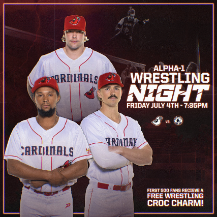 Gates open at 6:30 PM—get ready for a night of baseball and hard-hitting action! It’s Alpha-1 Wrestling Night, where the intensity of the ring meets the excitement of the ballpark. Don’t miss this epic evening as the Cardinals take the field and we bring the energy of pro wrestling to Bernie Arbour Stadium!