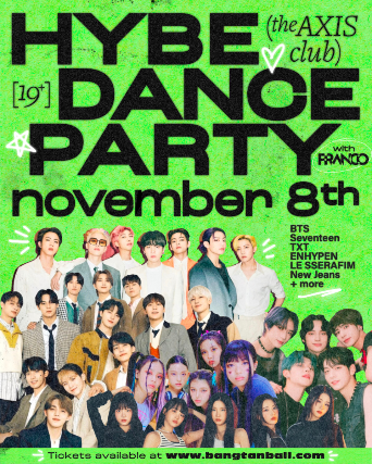 This is a LEGAL AGE 19+ show. DOORS: 9:00 PM SHOW: 9:00 PM LET'S HEAR IT FOR THE MULTIS! Pop off to all the k-bops at The Axis Club on Friday, November 8th for a night of BTS, SEVENTEEN, TXT, LE SSERAFIM, New Jeans & ENHYPEN! Doors open at 9:00 pm, and music stops at 1:00 am, so come early and stay late! โ—๏ธ19+ EVENT, GOVERNMENT-ISSUED ID REQUIRED โ—๏ธLOVE, RESPECT, AND SAFETY FOR ALL IS MANDATED   TICKETS INCLUDE: ๐Ÿ•บ A judgement-free dance floor to let your k-pop freak flag fly! ๐Ÿ“ธ Free photobooth from 9pm to 11pm ๐ŸŽŸ๏ธ Free raffle ticket upon entry for your chance to win prize after prize ๐Ÿฅ‚ Full access to a HYBE-inspired bar and photocards with each drink purchase   ๐Ÿ•บ Looking to make your experience AJU NICE? Reserve a booth with bottle service! ๐Ÿพ Returning to our Bangtan Ball dance parties are reserved booths for you and up to 7 of your moots! With a roped-off, group-themed booth, enjoy: ๐Ÿ‘ A dedicated and decorated space for you and your friends ๐Ÿ‘ 5 bottles of soju; upgrades available ๐Ÿ‘ Korean snacks ๐Ÿ‘ Extra goodies to take home   PLEASE NOTE: ALL TICKETS ARE FINAL & NON-REFUNDABLE. WARNING! Strobe lighting and other intense lighting will be used during this event. It may not be safe for those with epilepsy and other conditions with sensitivity to light. If you are interested in reserving a booth with bottle service, only one member of your party is required to purchase the booth ticket. The remaining 7 guests permitted are not required to purchase a General Admission ticket; however, the purchaser of the booth must provide Bangtan Ball with the names of the booth guests to be added to the guest list (a friendly reminder that only 8 guests are permitted per booth; no exceptions). Please note that the names of the booth attendees must be provided by October 25th, 2024 by emailing hello@bangtanball.com and names may NOT be changed once provided. Failure to provide guests names by this deadline may result in a less personalized experience. Booth reservations are non-refundable and non-transferrable.
