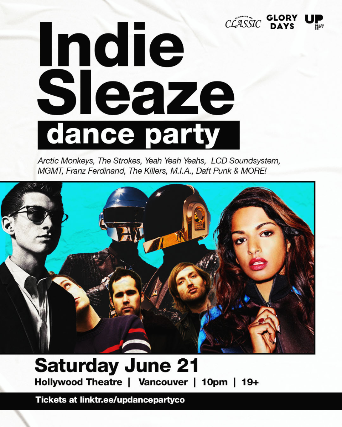 Vancouver, on Friday June 21st UP, Classics By Classic, and Glory Days take over for Indie Sleaze! Join us at Hollywood Theatre. We will be spinning the music of the Arctic Monkeys, The Strokes, Yeah Yeah Yeahs, LCD Soundsystem, MGMT, Franz Ferdinand, The Killers, M.I.A., Daft Punk & many MORE!