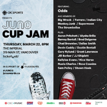 JUNO Cup players get together for a hockey hootenanny in support of MusiCounts, Canada’s music education charity associated with the JUNOS. The event will be a unique experience showcasing one-of-a-kind musical collaborations and covers by some of Canada’s most talented musicians participating in the 15th annual JUNO Cup.