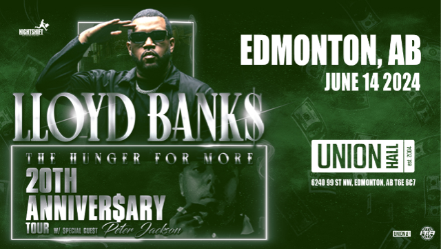 Nightshift Entertainment & Union Hall Present LLOYD BANKS The Hunger For More - 20th Anniversay Tour W/ Peter Jackson Friday June 14, 2024 Doors @ 8pm 18+ Event. Valid Government Photo ID Required Bottle Service Inquires Email: gm@unionhall.ca VIP - $59.99 -Priority Entrance -Priority Bar Service -Event Poster MEET AND GREET ADD ON - $50 -Meet and Greet Oportunity -Does not Include ticket to the show. You must also have a show ticket to use Meet and Greet Add on.