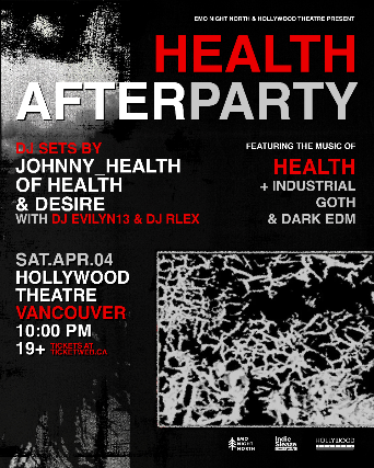 Official HEALTH after party with JOHNNY_HEALTH of HEALTH & Desire. Hosted by DJ Evilyn13 and DJ Rlex. Spinning the music of HEALTH, industrial x goth & dark EDM.