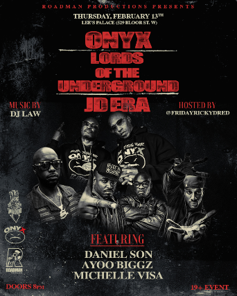 Onyx + Lords Of The Underground + JD Era also featuring Daniel Son, Ayoo Bigz and Michelle Visa Live At Lee’s Palace! Music By DJ Law. Hosted By Friday Ricky Dred