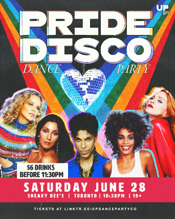 Happy pride Toronto! Join us for our Pride Disco Dance Party at Sneaky Dee’s on Saturday June 28th. Early bird tickets are $5 with $6 drinks before 11:30, see you there!