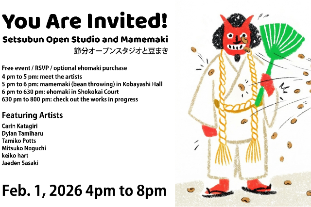 Over the past two months, six Nikkei artists have been taking part in workshops and developing artistic ideas that will be shared on February 1st. See works in progress, enjoy bean throwing to drive out the oni of misfortune, and see the JCCC building in a new light.