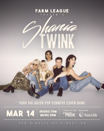 Shania Twink is an all-Queer band from Toronto, doing pop country and adjacent fierce femme bangers — think Shania Twain, Sheryl Crow, Tracy Chapman and others. They certainly hit hard within Queer spaces, but their appeal is much broader as well. They’re world-class musicians and performers, including a crossover in members of Dwayne Gretzky, as well as successful Canadian bands like July Talk, Bahamas, and more.