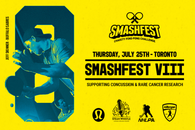 Smashfest® is a ping-pong-themed charity event where guests party with 25+ NHL players and have the opportunity to square off with and against them in the Smashfest® Pro-Am Doubles Tournament. This is followed by a singles bracket which crowns the NHL Player Champion. Held at Steam Whistle Brewery, tickets are tax deductible and the event features an open bar and catered buffet for all guests, who also have the opportunity to bid on one-of-kind silent and live auction items. Having now raised over $865,000 since 2012 to benefit concussion and rare cancer research, Smashfest® continues to grow each year.