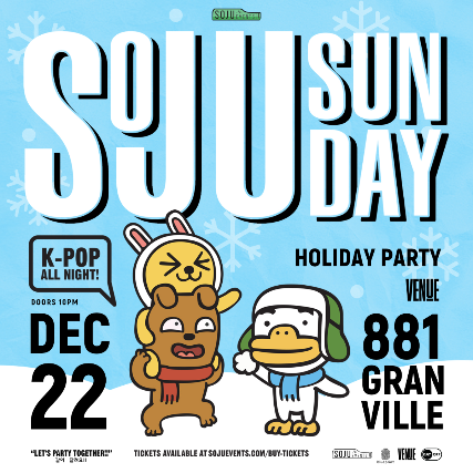 Join us for that special time of year at our Holiday edition of Soju Sunday. Come have a K-Poppin’ Holiday Party with us at Venue on Sun. December 22nd, it’s going to be LIT (literally)! Stage dancing, K-Pop + K-Hip Hop all night, Holiday themed drinks, special balloon drop packed with gifts and much more.   ‘Jeulgaeun krismas doeseyo’ (즐거운크리스마스되세요)