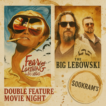 That’s right, Fifteen bucks. Two absolute cult legends (Fear and Loathing in Las Vegas and The Big Lebowski) back-to-back on the big screen, plus a freshly poured, specialty Sookram’s beer in your hand. Try finding a better deal in this town, Sook will wait. (Found nothing, did you :) )