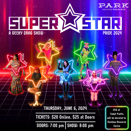 Come celebrate Winnipeg Pride 2024 with SUPER STAR at The Park Theatre, hosted by Aria Zero, featuring C.L.A.M., Feather Talia, Kymera, Peachy Keen, The Yellow Belle, and Traycee.