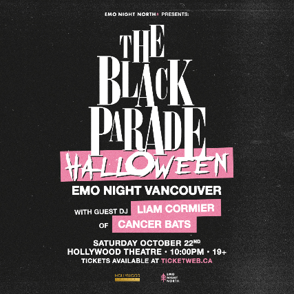 Vancouver, on Saturday October 22nd, we invite you to join the Black Parade! This time we're coming back with Liam Cormier of Cancer Bats to Guest DJ at Hollywood Theatre. And because Halloween will be just around the corner, we encourage costumes! As usual, we'll be spinning your favourite emo anthems all night long. Early bird tickets are just $10. Get yours before they're gone. Tell all your friends!