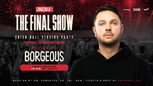 Union Hall, boodang and Nightshift Entertainment Presents THE LAST SHOW AT UNION HALL 22 Years of Legacy Featuring BORGEOUS Doors @ 9pm Free Before 10:30PM With RSVP 18+ Event. Valid Government Photo ID Required Bottle Service Inquires Email: gm@unionhall.ca