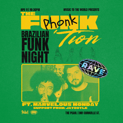 DJ/producer duo Marvelous Monday (DATGUYRY & SOKRATES) will be on deck all night with support from JAYDOYLE, spinning pure Baile Funk along with exclusive remixes of popular tracks, flipped with that signature funk bounce. No filler, no slow moments—just nonstop movement from start to finish.