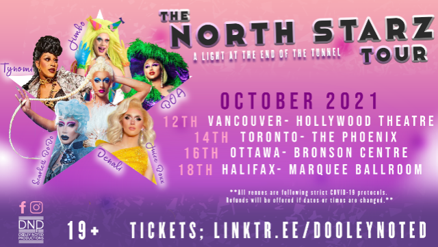 We finally see a light at the end of the tunnel. Join Dooley Noted Productions for The North Starz Tour featuring your favourite Canada's Drag Race cast members, Scarlett Bobo, BOA, Tynomi Banks, Juice Boxx, Jimbo and DENALI