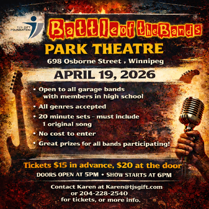 TJ’s Gift Foundation proudly presents a Battle of the Bands featuring high school musicians from across Winnipeg. This exciting night showcases the next generation of local talent as garage bands take the stage to perform live and compete for great prizes.