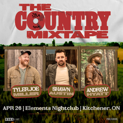 The Country Mixtape Tour is coming to your city in 2024! Featuring Canadian country music hitmakers Tyler Joe Miller, Shawn Austin, and Andrew Hyatt the tour will feature their collective hits mixed in with some of the artists’ favourite cover songs they grew up on. Tyler Joe Miller burst onto the scene in 2020 and has had a string of eight consecutive Top 10 singles, including two #1s with “Pillow Talkin’” and “I Would Be Over Me Too. Miller was nominated for three CCMA Awards in 2023 including Single of the Year for “Wild As Her”. Shawn Austin is hot off his CCMA Award nomination for Album of the Year, and continues to prove he is one of Canada’s fastest rising artists. He also recently celebrated his single “Tailgate to Heaven (feat. Chris Lane)” reaching gold-certification and his latest single “Settle for a Drink” recently hit the Top 10 at Canadian country radio. Andrew Hyatt recently released his acclaimed single “L is For” following his CCMA nomination for Album of the Year in 2023 and his CCMA Award win for Rising Star in 2022. Hyatt brings a string of hits to the tour including the hits “Neverland” and “Do It With You” among others. Together, Miller, Austin and Hyatt are bringing a concert experience to their fans like no other, creating a show you won’t want to miss!