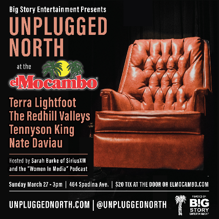 Join us for an amazing afternoon of acoustic performances at our monthly "Unplugged North" concert series presented by Big Story Entertainment. This month's show features the great JUNO nominated Folk Singer/Songwriter Terra Lightfoot, the exciting and talented 4-piece Americana & Roots Rock group The Redhill Valleys, the well travelled and melodic Indie Folk-Rock nomad Tennyson King, and the gifted Folk Singer/Songwriter Nate Daviau who is promoting his excellent new single "Listerine". Hosted by Sarah Burke of SiriusXM and the "Women in Media" podcast, Unplugged North provides you with the unique opportunity to spend a Sunday afternoon with first-rate artists in the best sounding room in Toronto. We hope to see you there!