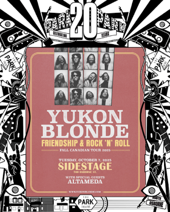 Tuesday, October 7th, 2025 Yukon Blonde - Friendship & Rock 'n' Roll presented by the Park Theatre at Sidestage, our Sister Venue, right next door to the Park Theatre w/ Special Guests Altameda Doors 7 pm Show 8 pm Tickets $25 Your photo ID is your ticket; have it ready at the door on the event night. For more info, visit The Park Theatre FAQ. Ticket Pickup: Collect your e-tickets at the ticket window at door time on show night. If you're buying multiple tickets, it’s best if your whole party is present. Remember to have your photo ID for entry.